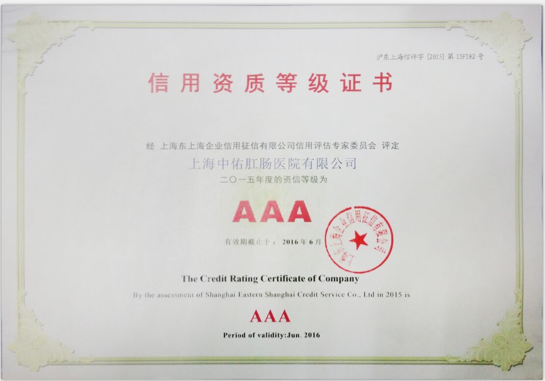 近日,经过上海东上海企业信用征信有限公司信用评估医生委员会评定,授予上海中佑肛肠医院“AAA资信等级”证书。肯定了上海中佑肛肠医院正规、合理、透明收费的信誉,是上海肛肠病患者可以放心选择的正规肛肠专科医院。